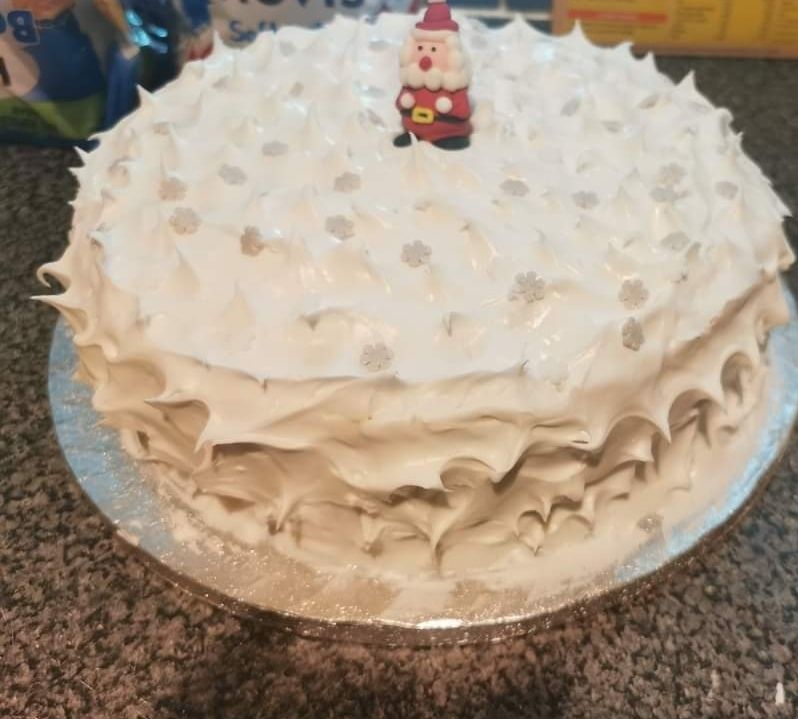 Multiple fruits soaked in Brandy for several days, a baked cake fed for 6 weeks with brandy, hand cut marzipan and textured royal icing.